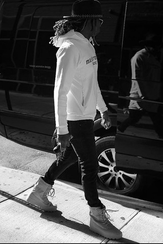 Future spotted wearing Yeezy Season 950 Boots and rocking a white Mastermind Homme hoodie.